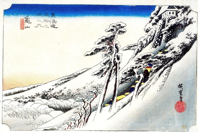 Wir bieten Ihnen eine handgefertigte Reproduktion auf Leinwand des berühmten Kunstwerks 'Kameyama' von Hiroshige, aus dem Reproduktionsmuseum.