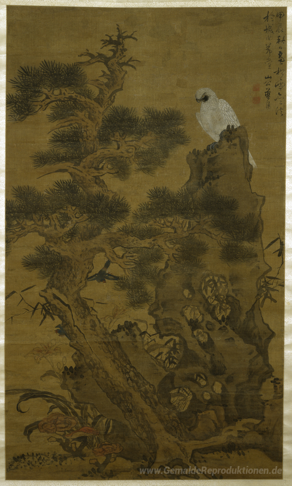 Wir bieten Ihnen eine handgefertigte Reproduktion auf Leinwand des berühmten Kunstwerks 'Kiefer, White Hawk, und Rock-' von Lan Ying, aus dem Reproduktionsmuseum.