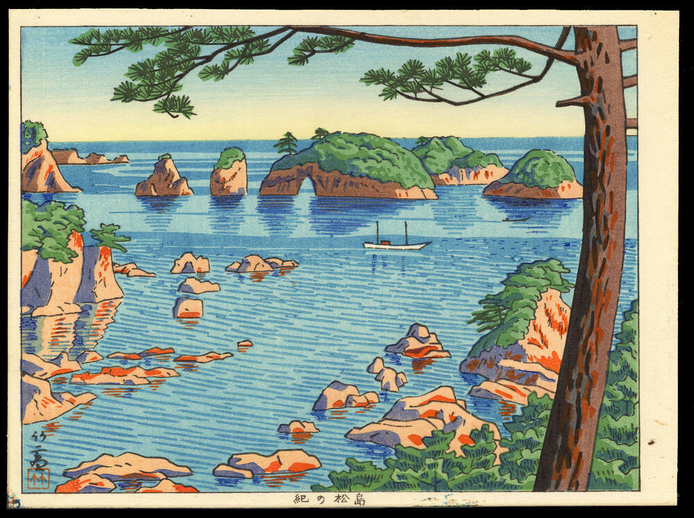 Wir bieten Ihnen eine handgefertigte Reproduktion auf Leinwand des berühmten Kunstwerks 'Kinomastushima' von Asano Takeji, aus dem Reproduktionsmuseum.