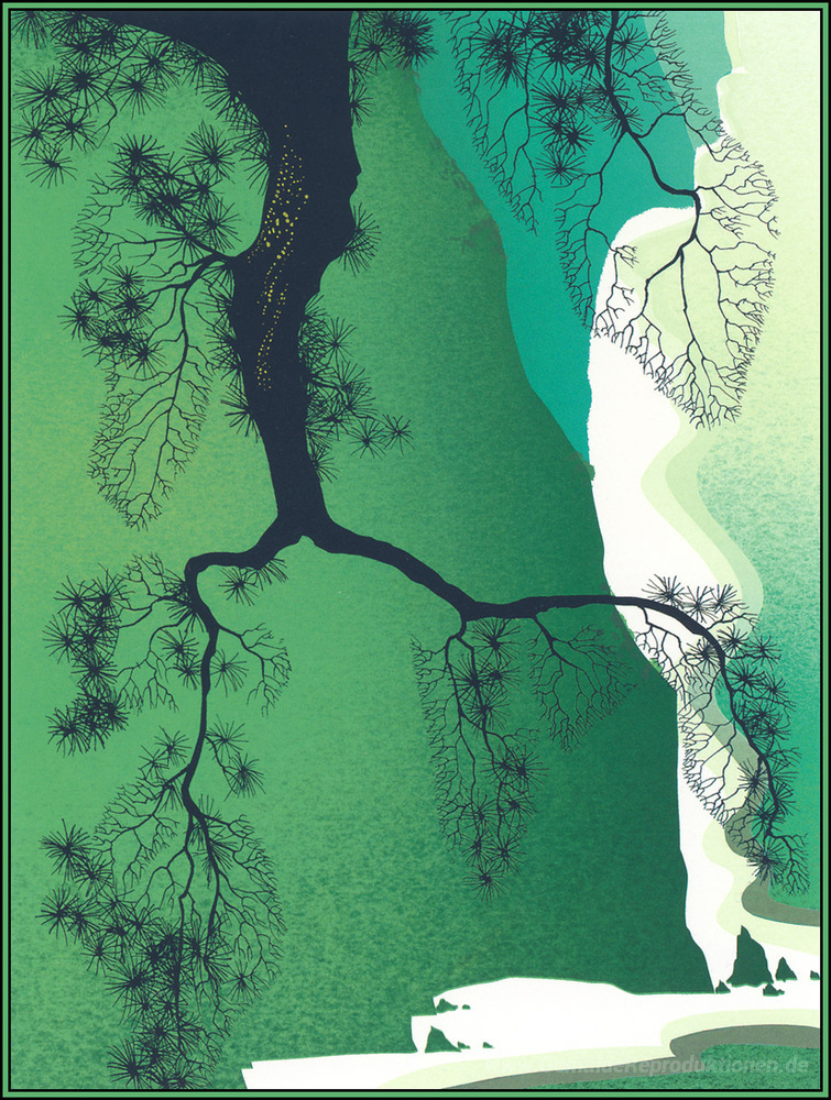 Wir bieten Ihnen eine handgefertigte Reproduktion auf Leinwand des berühmten Kunstwerks 'Klippen und Kiefern-Niederlassung' von Eyvind Earle, aus dem Reproduktionsmuseum.