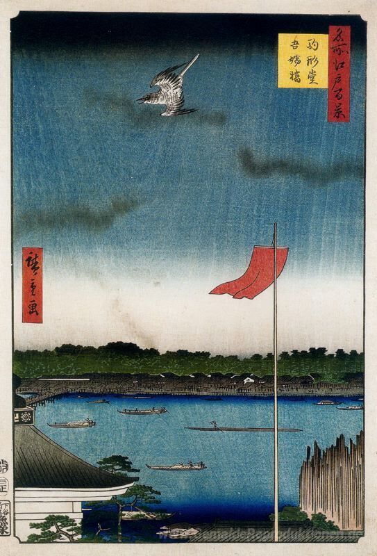 Wir bieten Ihnen eine handgefertigte Reproduktion auf Leinwand des berühmten Kunstwerks 'Komokata Hall und Azuma-Brücke' von Hiroshige, aus dem Reproduktionsmuseum.