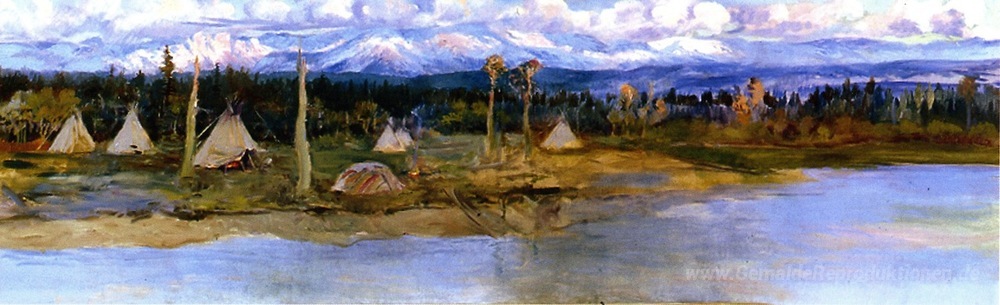 Wir bieten Ihnen eine handgefertigte Reproduktion auf Leinwand des berühmten Kunstwerks 'Kootenai Camp am Swan Lake (unvollendet)' von Charles M. Russell, aus dem Reproduktionsmuseum.