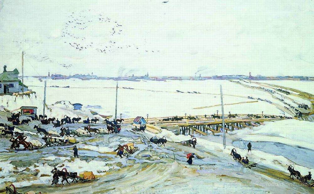 Wir bieten Ihnen eine handgefertigte Reproduktion auf Leinwand des berühmten Kunstwerks 'Kreuzung durch Oka. Nizhny Novgorod' von Konstantin Yuon, aus dem Reproduktionsmuseum.
