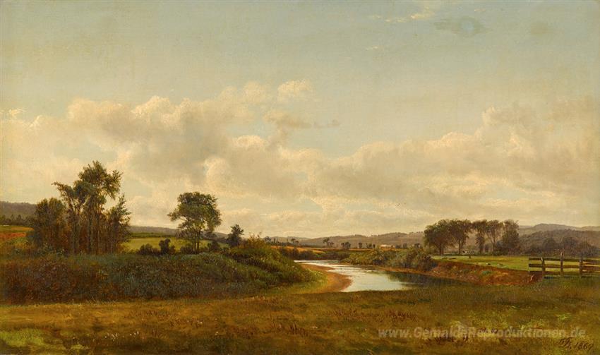 Wir bieten Ihnen eine handgefertigte Reproduktion auf Leinwand des berühmten Kunstwerks 'Lancaster New Hampshire Farmland' von David Johnson, aus dem Reproduktionsmuseum.