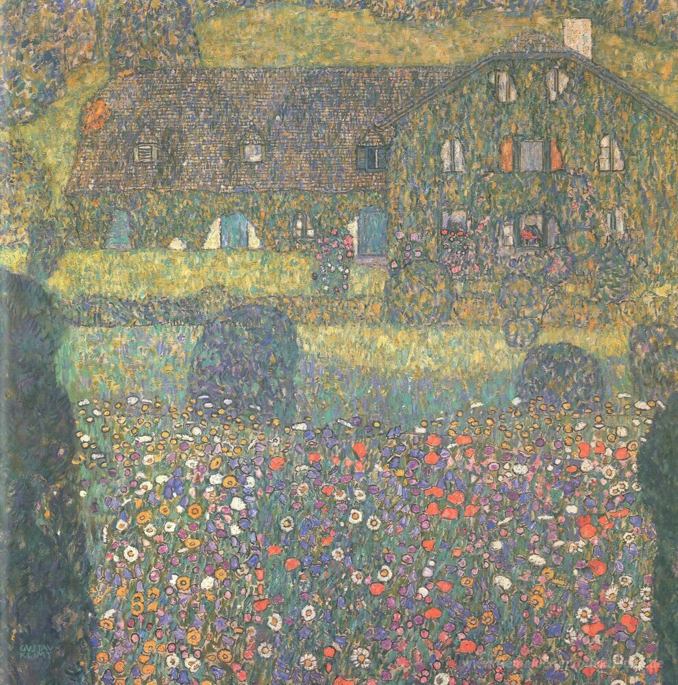 Wir bieten Ihnen eine handgefertigte Reproduktion auf Leinwand des berühmten Kunstwerks 'Landhaus durch das Attersee' von Gustav Klimt, aus dem Reproduktionsmuseum.