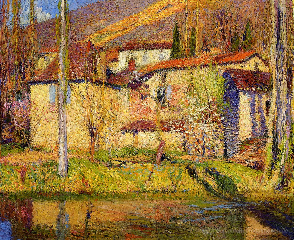 Wir bieten Ihnen eine handgefertigte Reproduktion auf Leinwand des berühmten Kunstwerks 'Landschaft in der Nähe von Toulouse' von Henri Martin, aus dem Reproduktionsmuseum.