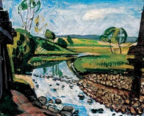 Wir bieten Ihnen eine handgefertigte Reproduktion auf Leinwand des berühmten Kunstwerks 'Landschaft in Krahovice' von Bertalan Por, aus dem Reproduktionsmuseum.