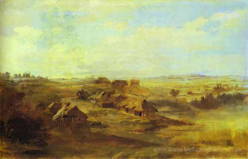 Wir bieten Ihnen eine handgefertigte Reproduktion auf Leinwand des berühmten Kunstwerks 'Landschaft mit Bauernhütten und Teich in der Nähe von St. Peters' von Fyodor Vasilyev, aus dem Reproduktionsmuseum.