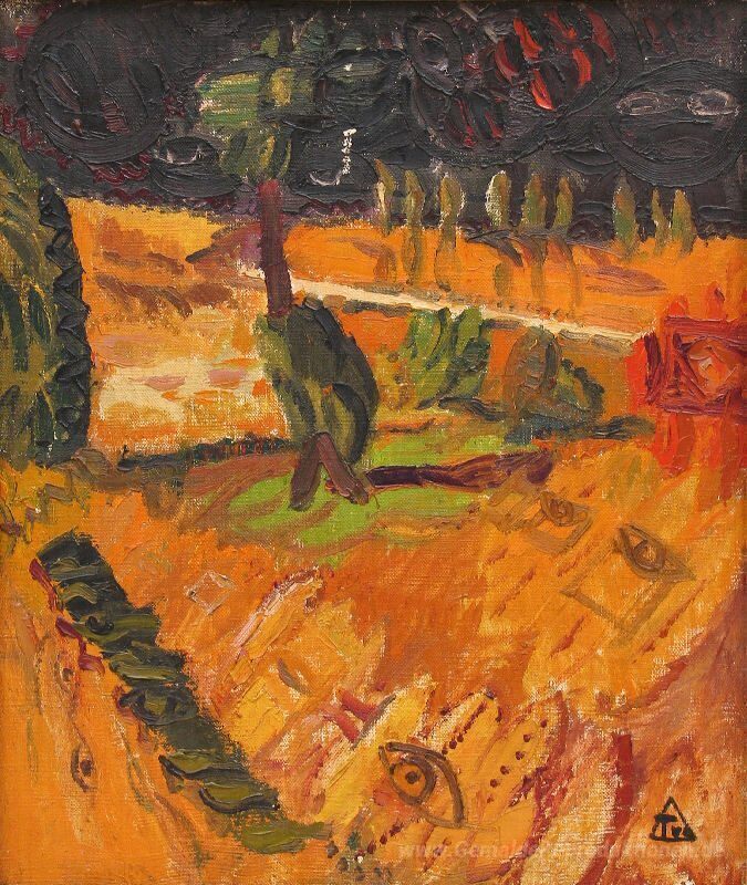 Wir bieten Ihnen eine handgefertigte Reproduktion auf Leinwand des berühmten Kunstwerks 'Landschaft mit Baum' von Ion Tuculescu, aus dem Reproduktionsmuseum.
