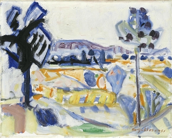 Wir bieten Ihnen eine handgefertigte Reproduktion auf Leinwand des berühmten Kunstwerks 'Landschaft mit blühenden Bäumen' von Max Gubler, aus dem Reproduktionsmuseum.