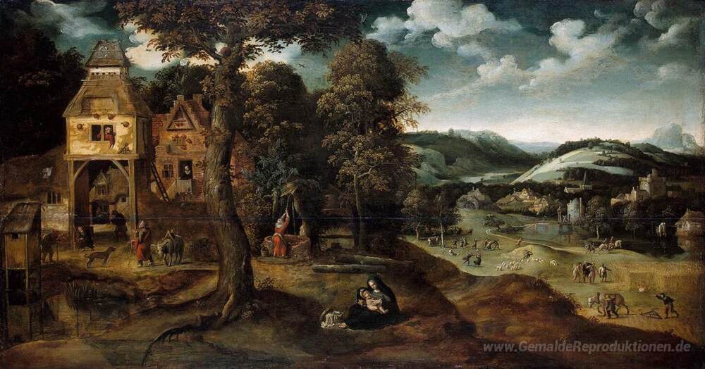 Wir bieten Ihnen eine handgefertigte Reproduktion auf Leinwand des berühmten Kunstwerks 'Landschaft mit der Flucht nach Ägypten' von Joachim Patinir, aus dem Reproduktionsmuseum.