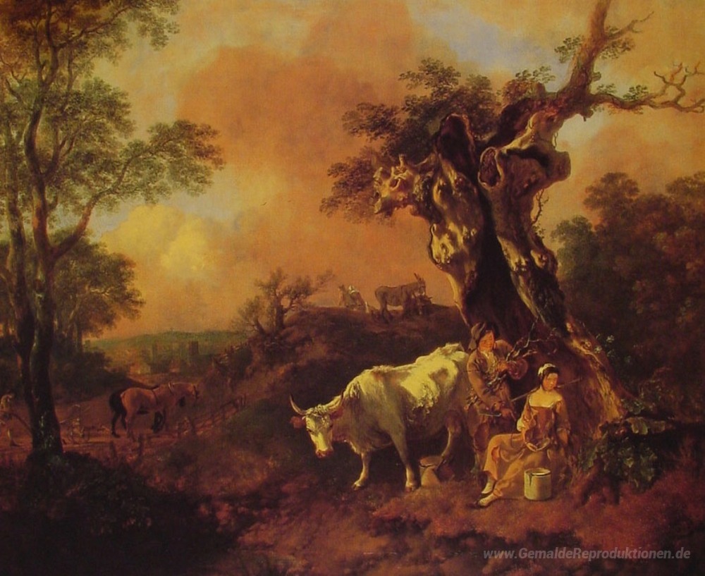 Wir bieten Ihnen eine handgefertigte Reproduktion auf Leinwand des berühmten Kunstwerks 'Landschaft mit einem Holzfäller und Milchmädchen' von Thomas Gainsborough, aus dem Reproduktionsmuseum.