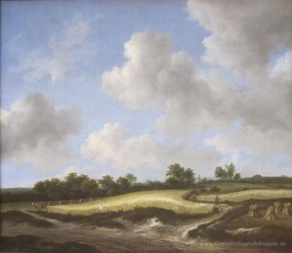 Wir bieten Ihnen eine handgefertigte Reproduktion auf Leinwand des berühmten Kunstwerks 'Landschaft mit einem Weizenfeld' von Jacob Isaakszoon van Ruisdael, aus dem Reproduktionsmuseum.
