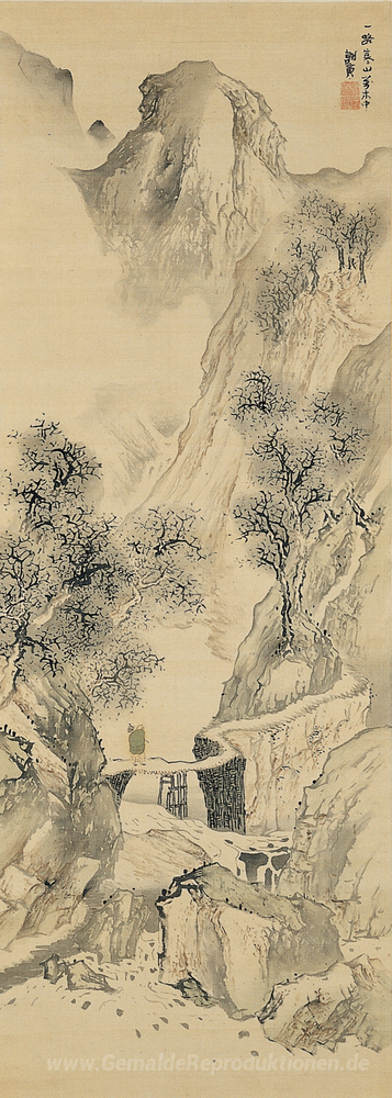Wir bieten Ihnen eine handgefertigte Reproduktion auf Leinwand des berühmten Kunstwerks 'Landschaft mit einer einsamen Reisenden' von Yosa Buson, aus dem Reproduktionsmuseum.