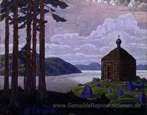 Wir bieten Ihnen eine handgefertigte Reproduktion auf Leinwand des berühmten Kunstwerks 'Landschaft mit Kapelle' von Nicholas Roerich, aus dem Reproduktionsmuseum.