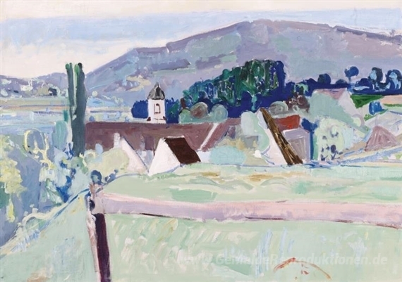 Wir bieten Ihnen eine handgefertigte Reproduktion auf Leinwand des berühmten Kunstwerks 'Landschaft mit Kloster Fahr, Unterengstringen' von Max Gubler, aus dem Reproduktionsmuseum.