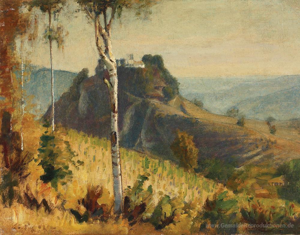 Wir bieten Ihnen eine handgefertigte Reproduktion auf Leinwand des berühmten Kunstwerks 'Landschaft mit Stronghold' von Stefan Popescu, aus dem Reproduktionsmuseum.