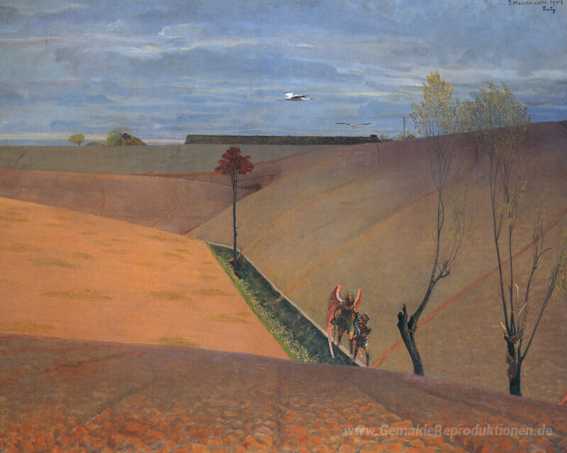 Wir bieten Ihnen eine handgefertigte Reproduktion auf Leinwand des berühmten Kunstwerks 'Landschaft mit Tobia' von Jacek Malczewski, aus dem Reproduktionsmuseum.