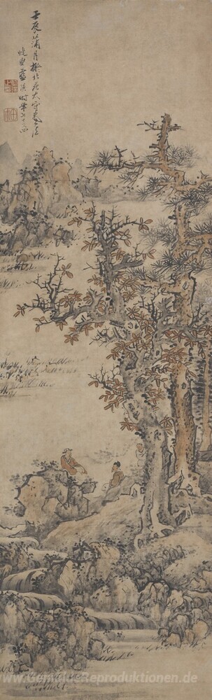Wir bieten Ihnen eine handgefertigte Reproduktion auf Leinwand des berühmten Kunstwerks 'Landschaft nach Dong Yuan' von Lan Ying, aus dem Reproduktionsmuseum.