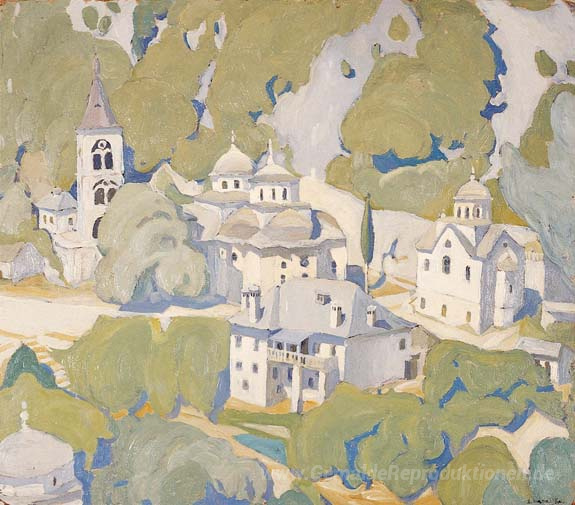 Wir bieten Ihnen eine handgefertigte Reproduktion auf Leinwand des berühmten Kunstwerks 'Landschaft' von Spyros Papaloukas, aus dem Reproduktionsmuseum.