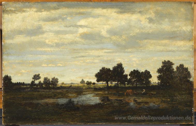 Wir bieten Ihnen eine handgefertigte Reproduktion auf Leinwand des berühmten Kunstwerks 'Landschaft' von Theodore Rousseau, aus dem Reproduktionsmuseum.