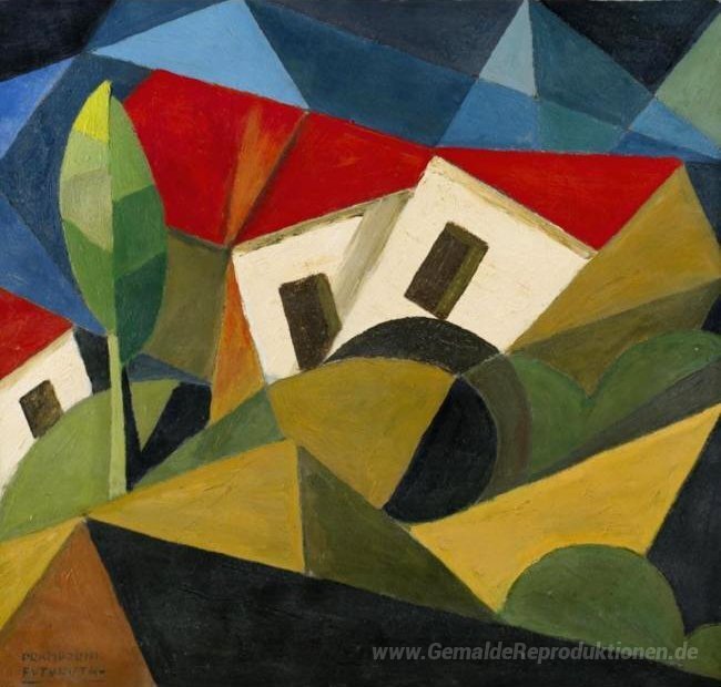 Wir bieten Ihnen eine handgefertigte Reproduktion auf Leinwand des berühmten Kunstwerks 'Landschaft' von Enrico Prampolini, aus dem Reproduktionsmuseum.