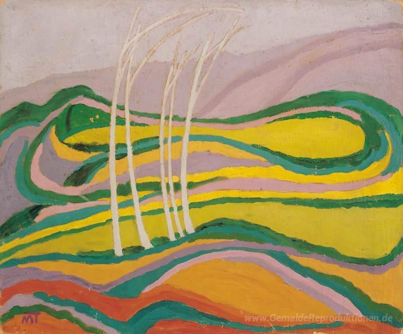 Wir bieten Ihnen eine handgefertigte Reproduktion auf Leinwand des berühmten Kunstwerks 'Landschaft' von Janos Mattis-Teutsch, aus dem Reproduktionsmuseum.