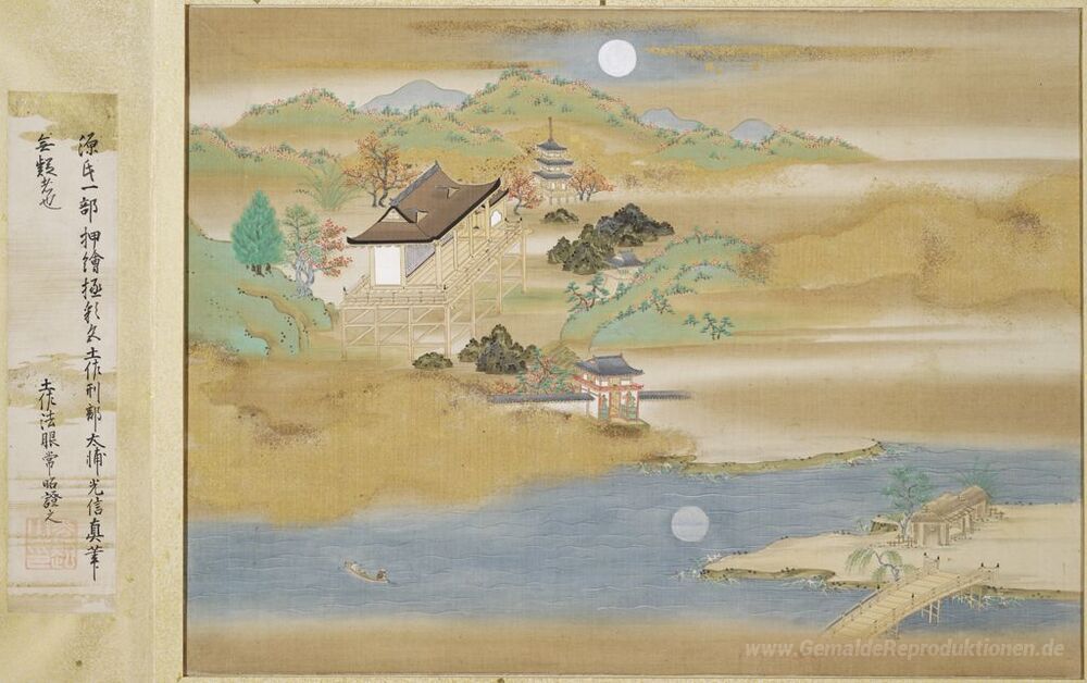 Wir bieten Ihnen eine handgefertigte Reproduktion auf Leinwand des berühmten Kunstwerks 'Landschaft rund um Ishiyama-dera und Biwa-See' von Tosa Mitsuoki, aus dem Reproduktionsmuseum.