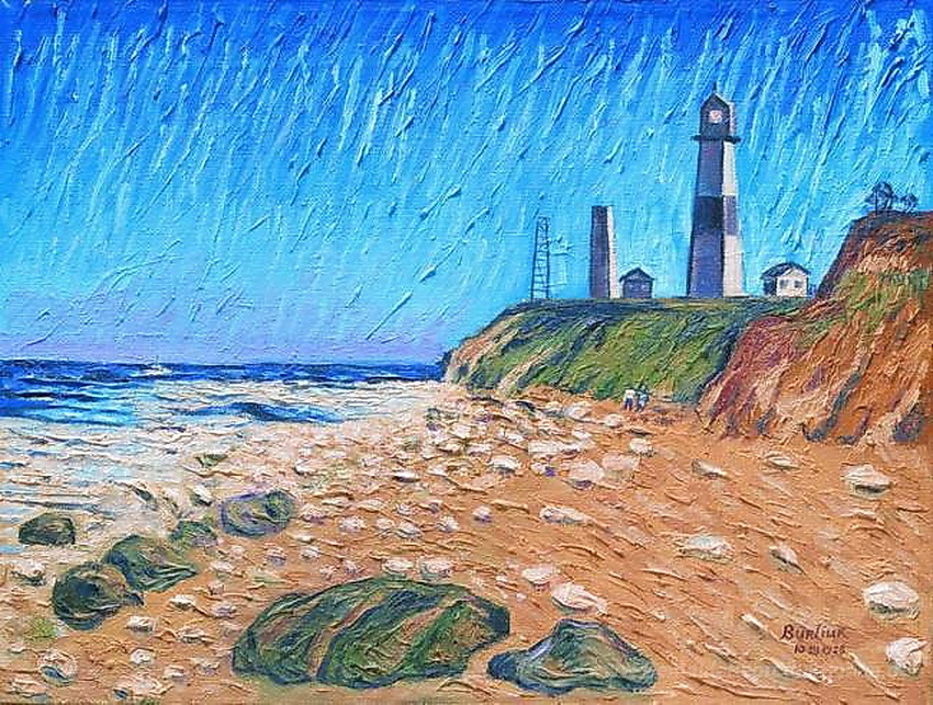 Wir bieten Ihnen eine handgefertigte Reproduktion auf Leinwand des berühmten Kunstwerks 'Leuchtturm an der Küste' von David Burliuk, aus dem Reproduktionsmuseum.