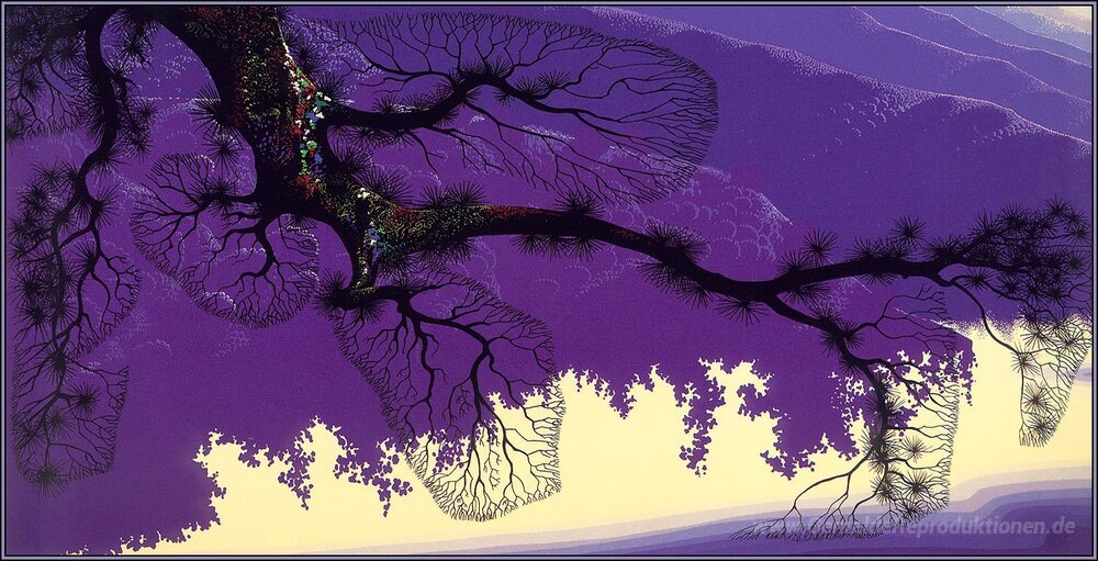 Wir bieten Ihnen eine handgefertigte Reproduktion auf Leinwand des berühmten Kunstwerks 'Lila Küstenlandschaft' von Eyvind Earle, aus dem Reproduktionsmuseum.