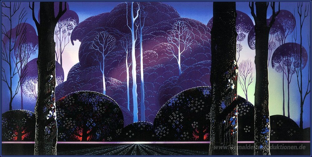 Wir bieten Ihnen eine handgefertigte Reproduktion auf Leinwand des berühmten Kunstwerks 'Lila Sonnenaufgang' von Eyvind Earle, aus dem Reproduktionsmuseum.