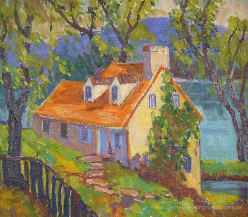 Wir bieten Ihnen eine handgefertigte Reproduktion auf Leinwand des berühmten Kunstwerks 'Lumberville Cottage' von Fern Coppedge, aus dem Reproduktionsmuseum.