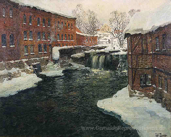 Wir bieten Ihnen eine handgefertigte Reproduktion auf Leinwand des berühmten Kunstwerks 'Mühle Szene' von Frits Thaulow, aus dem Reproduktionsmuseum.