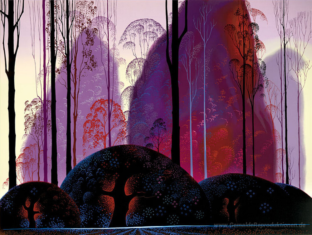 Wir bieten Ihnen eine handgefertigte Reproduktion auf Leinwand des berühmten Kunstwerks 'Mauve, rot und lila' von Eyvind Earle, aus dem Reproduktionsmuseum.