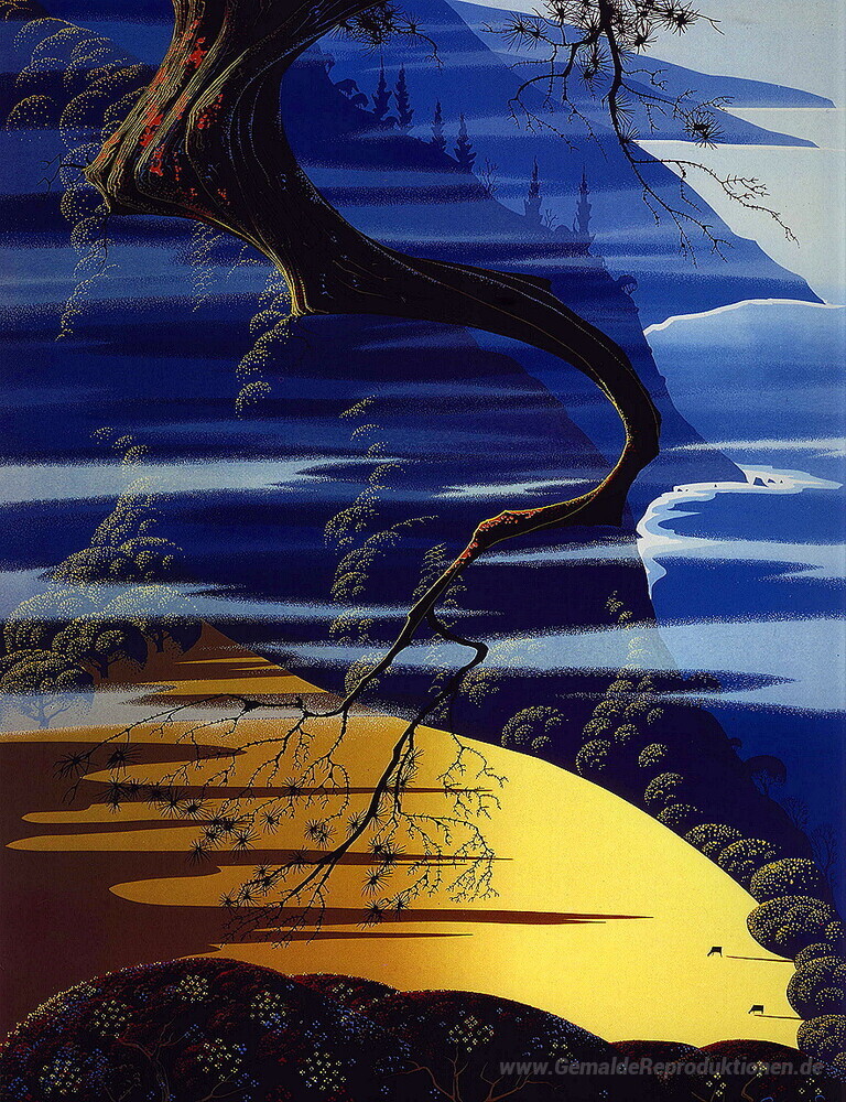 Willkommen in der faszinierenden Welt der Ölgemälde, wo jede Farbnuance und Pinselstrich eine Geschichte erzählt. Unsere Kollektion umfasst Meisterwerke wie Meer, Cliff und Pine des renommierten Künstlers Eyvind Earle. Earle ist bekannt für seinen einzigartigen Stil, der Elemente des Expressionismus und der romantischen Landschaftsmalerei kombiniert. Seine Werke zeichnen sich durch lebendige Farben und präzise Details aus, die den Betrachter in eine traumhafte Atmosphäre entführen.
