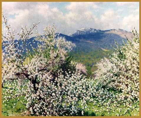 Wir bieten Ihnen eine handgefertigte Reproduktion auf Leinwand des berühmten Kunstwerks 'Monadnock Orchard' von Richard Whitney, aus dem Reproduktionsmuseum.