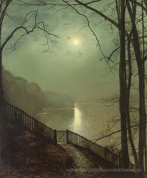 Wir bieten Ihnen eine handgefertigte Reproduktion auf Leinwand des berühmten Kunstwerks 'Mondschein auf dem See Roundhay Park Leeds' von John Atkinson Grimshaw, aus dem Reproduktionsmuseum.