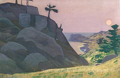Wir bieten Ihnen eine handgefertigte Reproduktion auf Leinwand des berühmten Kunstwerks 'Monhegan (Märchen)' von Nicholas Roerich, aus dem Reproduktionsmuseum.
