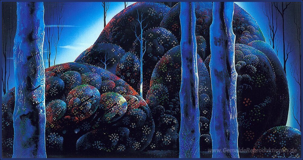 Wir bieten Ihnen eine handgefertigte Reproduktion auf Leinwand des berühmten Kunstwerks 'Moonlit Eucalyptus' von Eyvind Earle, aus dem Reproduktionsmuseum.