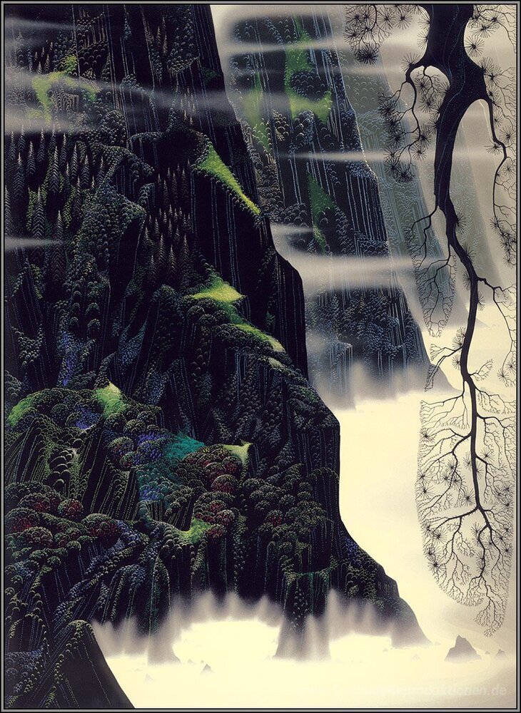 Wir bieten Ihnen eine handgefertigte Reproduktion auf Leinwand des berühmten Kunstwerks 'Morgengrauen' von Eyvind Earle, aus dem Reproduktionsmuseum.