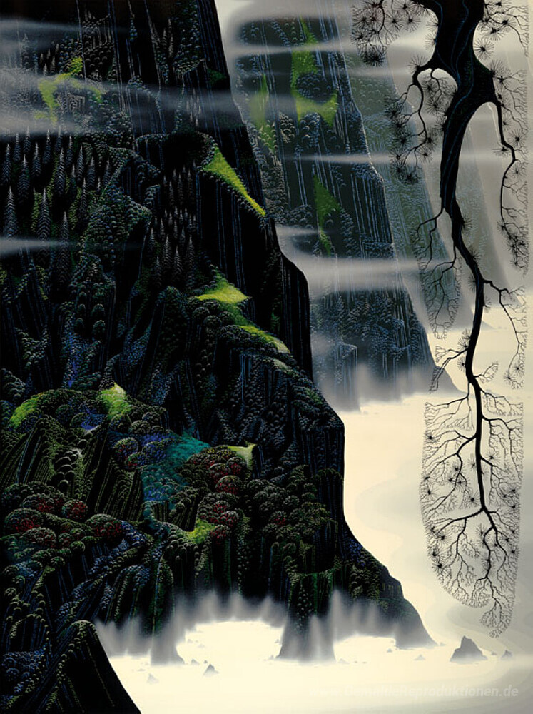 Wir bieten Ihnen eine handgefertigte Reproduktion auf Leinwand des berühmten Kunstwerks 'Morgengrauen' von Eyvind Earle, aus dem Reproduktionsmuseum.