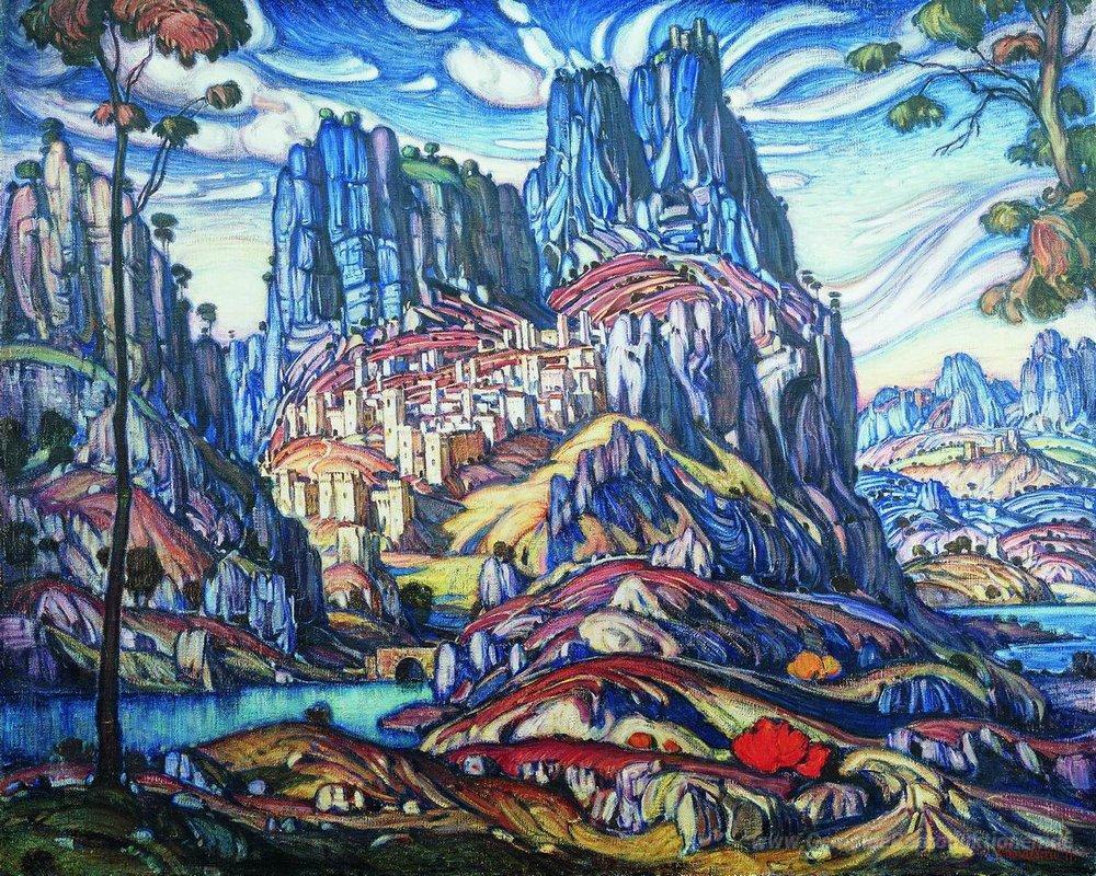 Wir bieten Ihnen eine handgefertigte Reproduktion auf Leinwand des berühmten Kunstwerks 'Mount St. George' von Konstantin Bogaevsky, aus dem Reproduktionsmuseum.