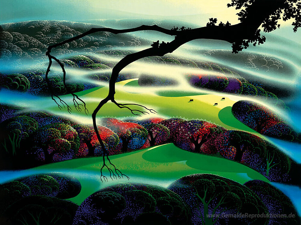 Wir bieten Ihnen eine handgefertigte Reproduktion auf Leinwand des berühmten Kunstwerks 'Nebel eingehüllt' von Eyvind Earle, aus dem Reproduktionsmuseum.