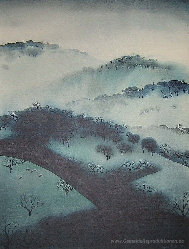 Wir bieten Ihnen eine handgefertigte Reproduktion auf Leinwand des berühmten Kunstwerks 'Neblige Berge' von Eyvind Earle, aus dem Reproduktionsmuseum.