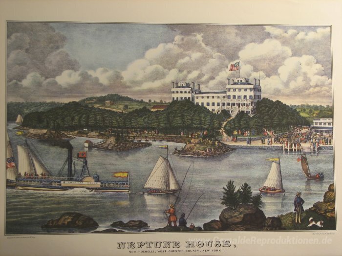 Wir bieten Ihnen eine handgefertigte Reproduktion auf Leinwand des berühmten Kunstwerks 'Neptun-Haus' von Currier and Ives, aus dem Reproduktionsmuseum.