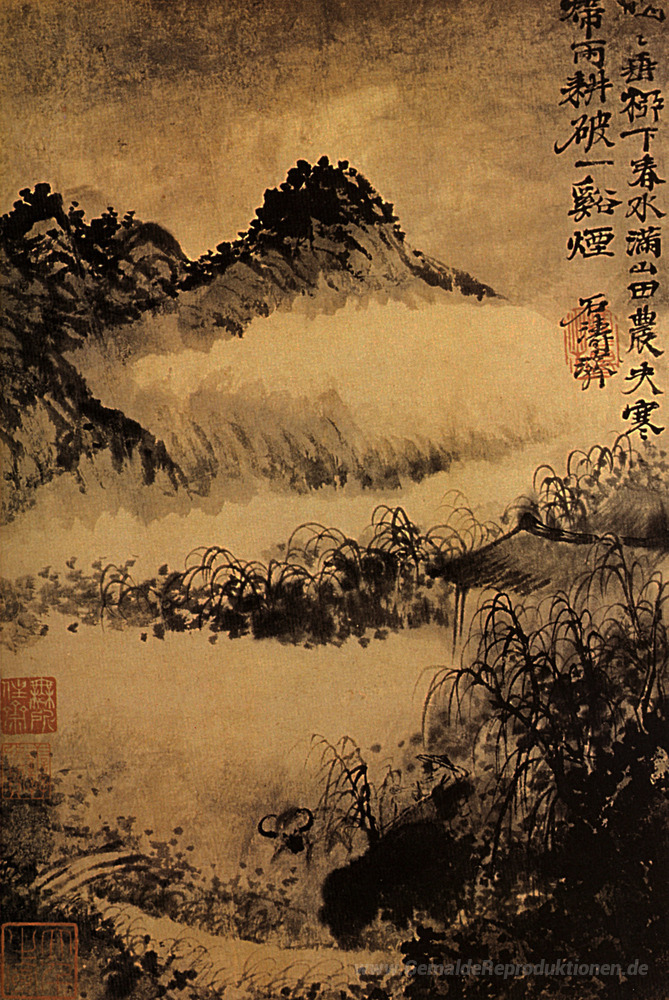 Wir bieten Ihnen eine handgefertigte Reproduktion auf Leinwand des berühmten Kunstwerks 'Nicht weit von Mount Huang, der Büffel im Reisfeld' von Shitao, aus dem Reproduktionsmuseum.