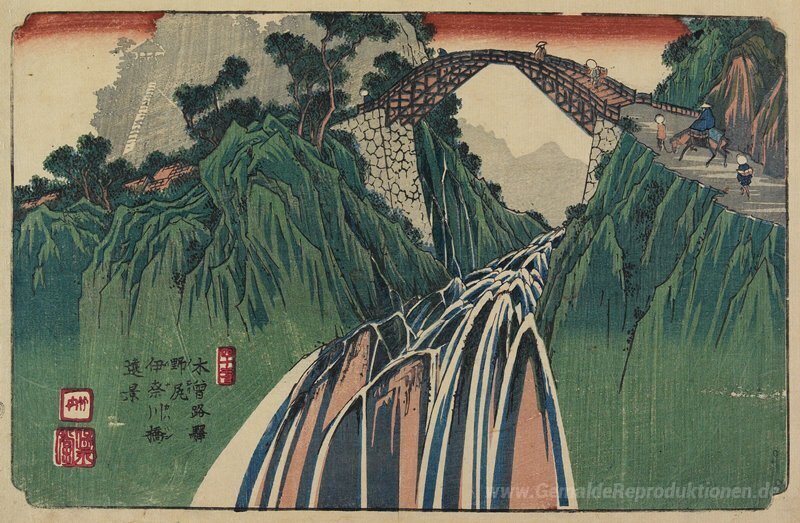 Wir bieten Ihnen eine handgefertigte Reproduktion auf Leinwand des berühmten Kunstwerks 'No.41 Entfernte Ansicht der Brücke in der Nähe von Kanagawa Noji' von Keisai Eisen, aus dem Reproduktionsmuseum.
