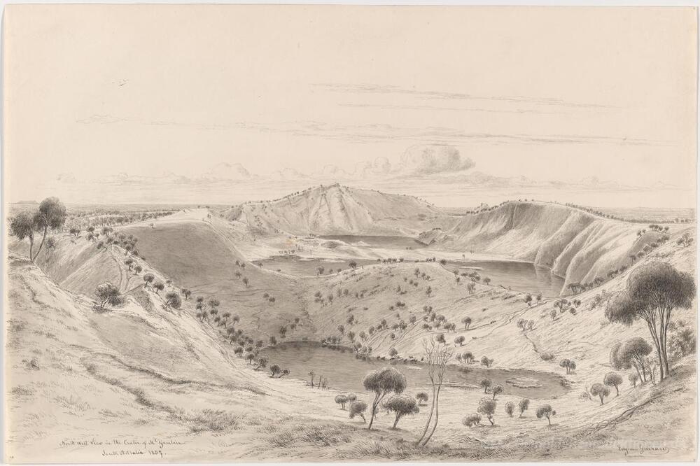 Wir bieten Ihnen eine handgefertigte Reproduktion auf Leinwand des berühmten Kunstwerks 'Nordwestansicht im Krater des Mt. Gambier, South Australia' von Eugene von Guerard, aus dem Reproduktionsmuseum.