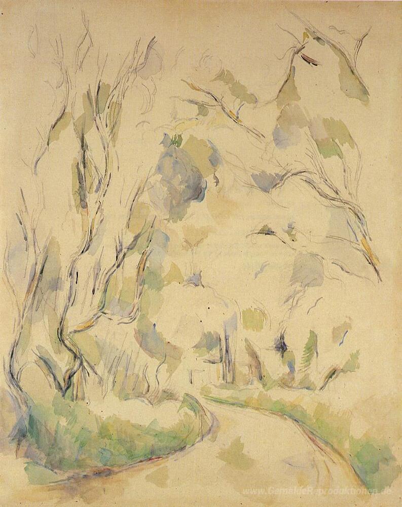 Wir bieten Ihnen eine handgefertigte Reproduktion auf Leinwand des berühmten Kunstwerks 'Nun durch die kurvenreiche Straße in den Park von Chateau Noir' von Paul Cezanne, aus dem Reproduktionsmuseum.