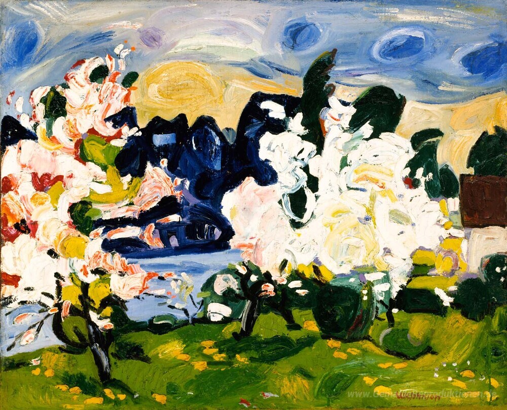 Wir bieten Ihnen eine handgefertigte Reproduktion auf Leinwand des berühmten Kunstwerks 'Obstbäume und Berge' von William H. Johnson, aus dem Reproduktionsmuseum.